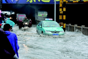 此处的机动车道已经禁止通行,所有的机动车都从两边的雨水较浅的非机动车道通行,两边的非机动车道水深也达50厘米,不少机动车不敢涉水,只能折返,此路段堵车近百米。此外,在张店柳泉路与共青团西路路口路段,堵车也比较严重,有的轿车排气管进水导致车辆抛锚。