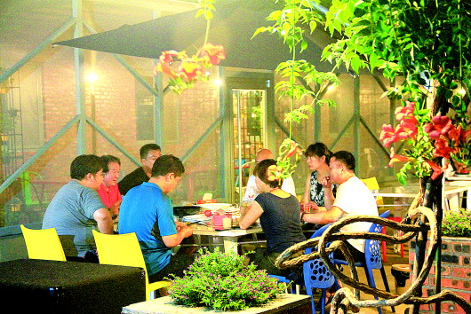 绿树浓荫下,处处花团锦簇,遮阳伞下的桌椅整洁、雅致。这里的主打菜品为全国知名的江苏盱眙龙虾,鲜活肥嫩,经名厨烹饪后,味道鲜美,麻辣适中,或白酒几杯,或啤酒数扎,堪称人间享受。同时,清香、新鲜的肥蛤,也是这里的一大特色,肥蛤入口,细细咀嚼,顿觉地道的海鲜之美。另外,各种烧烤、时令小菜也显得与众不同。羊肉串不仅肉鲜味香,烤得更是恰到火候,令人闻到便食欲顿生。由于大都是自己种植的无公害蔬菜,这里的西红柿、黄瓜等,咬一口便让人回忆起若干年前那种久违的自然甜美。更让人惊讶的是这里的价格,亲民、公道,让人觉得物超所值。
