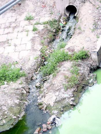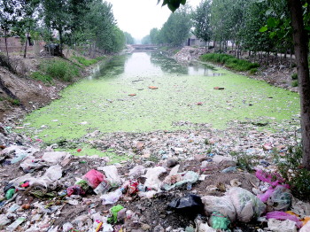 陵县护城河自南向北穿越了陵县城市住宅区,河流两岸老式砖瓦屋林立,几乎每家每户都有一个水泥材质的排污管,将泔水、粪便、生活污水等直接排到河中,一层层的暗黑色絮状物体漂浮在水面,臭味四散。