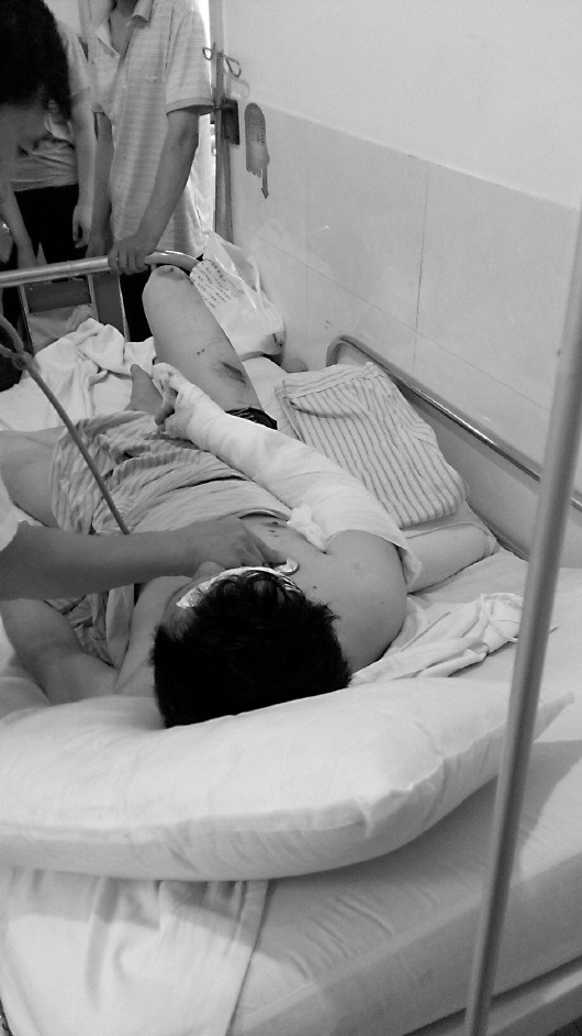 1日早上8点多,在潍坊市人民医院记者见到了被撞伤的3人。被撞伤的柳先生说,6月30日晚上9点半,他下班往家走,在虞河路和南乐道街交叉口,一辆轿车突然飞驰而来,他还没反应过来,就被撞上了。柳先生现在手足骨外科住院,身上伤痕累累。柳先生的家属说,柳先生的舌头断了,牙掉了几颗,肺被撞破,肋骨骨折,眉骨处骨折,左前臂粉碎性骨折。