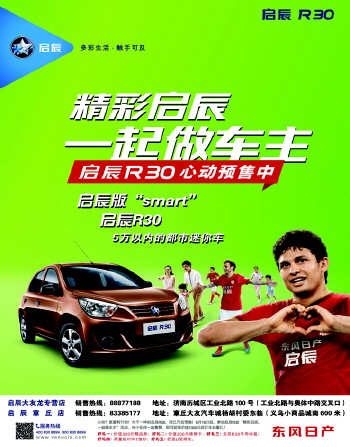 备受关注的“精彩易享家用车”启辰R30自北京车展揭开神秘面纱以后,又在各地方车展演绎多彩汽车生活大放异彩。凭借超越竞品的产品实力以及超越期待的性价比魅力,启辰R30成为众多首次购车消费者十分期待的车型之一。4.28万元的预售价格,也兑现了东风日产此前“R30主力车型售价将全面位于5万元以下”的官方承诺。在5万元以下区间,启辰R30无疑是最具竞争力的车型。当天,东风日产除了宣布启辰R30的预售价格外,启辰R30的“精彩启辰,一起做车主”预售活动,也正式推出。自6月18日起,凡登录官网参加启辰R30“精彩启辰,一起做车主”活动,集够10个点赞,或者邀请三个以上亲友一起预定R30,就可劲享价值1000元的预售订车五重好礼。包括:好礼一、价值300元精品券;好礼二、价值200元维修卡;好礼三、启辰R30专用地毯;好礼四、限量版时尚T恤衫;好礼五、舒适U型颈枕。您是不是早已迫不及待了呢?不用着急,启辰大友龙R30现已火热预售中!7月份即将在济南上市,届时会与广大济南朋友见面!欢迎来电咨询!销售热线:88877188 83385177