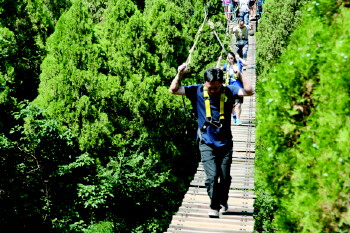 现在的红叶谷已被万棵树木所覆盖,青山绿水,蓝天白云,为这个夏季带来一丝凉意和清新的空气。有几个团队正在拓展训练,响亮的口号,团结协作的精神,爽朗的笑声打破了山谷的寂静。勇敢者之路、缅甸桥、信任背摔、依存共渡…… (文/王茜 摄影/方刚)