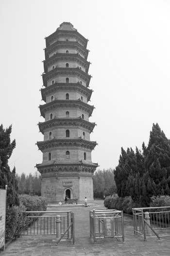 舍利塔为砖木结构的阁楼式砖塔,高61米,九级八面,每面长4.9米,通体近乎垂直,塔顶像个将军头盔。塔的外檐是夸木结构,有仿木陶质的出挑斗拱,转角斗拱下,垂着陶质的莲花垂柱,门楣上则镌刻“舍利宝塔”四字。