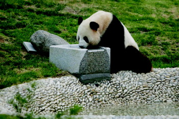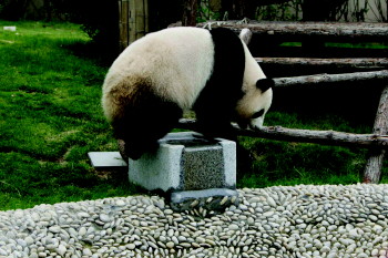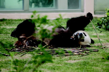 吃过早饭,爱美的“小姑娘”贝贝开始剔牙:拿着一根尖尖的竹子,伸进嘴中,剔完左边剔右边,直到把两边的牙都剔干净才把竹子放下。随后,贝贝开始在院子里绕圈踱步来消食。与贝贝相比,“小伙子”蜀云显得精神不足,吃完早饭后,一直若有所思地坐在原地发呆,发呆过后突然后仰躺下,在地上不停地伸懒腰,然后就赖在地上不起了。