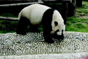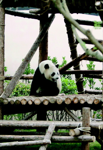 7:40,蜀云和贝贝从睡梦中醒来,慢悠悠从“卧室”来到院子里。黑白相间的脑袋刚露出来,期盼已久的游客中发出了一阵惊叹声。