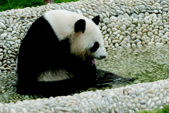 早上8点,气温逐渐升高。运动了一身汗的贝贝转身来到了水池边想洗个澡。下水前,贝贝还用一只爪子试了试水温,感觉水温合适才下水。毕竟是“女孩子”,贝贝泡澡时一直背对着游客。可能是泡澡太舒服,贝贝也忘了“害羞”,直接转过身面对游客的目光。洗完澡,爱好爬高的贝贝来到木架子前,身手矫健地爬了上去,然后找了个舒服的地方趴下来想睡个回笼觉。