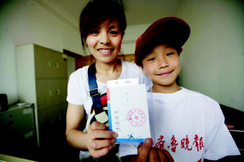 小报童吴旭和妈妈展示领取到的本报暑期营销秀小报童报名证件和衣服。 本报记者 张晓鹏 摄