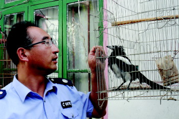 胶州市民彭海业曾在几年前救下了一只垂死喜鹊,经过半年的训练,这只喜鹊已经会说“恭喜发财”“你好”。青岛林业局森保站野生动物保护专家迟仁平介绍,喜鹊会说话已有先例,如果一只有“天赋”的喜鹊遇到会训练它的“伯乐”,能够模仿人类说话也是顺理成章的。图为彭海业正在引逗喜鹊说“恭喜发财”。