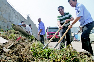 7月1日,威海市城管执法局环翠分局嵩山中队执法人员联合范家埠村党员50余人,对辖区路边乱堆乱放进行集中清理整治。