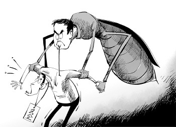 近日有媒体报道称,江苏淮安经济技术开发区发展局一副局长,在介入当地一民营企业破产处理的过程中,将其吃、住、行、游的巨额费用交由该企业报销。企业员工数年来多次举报,当地司法机关却始终不予理睬。(7月2日新华网) 漫画/勾犇