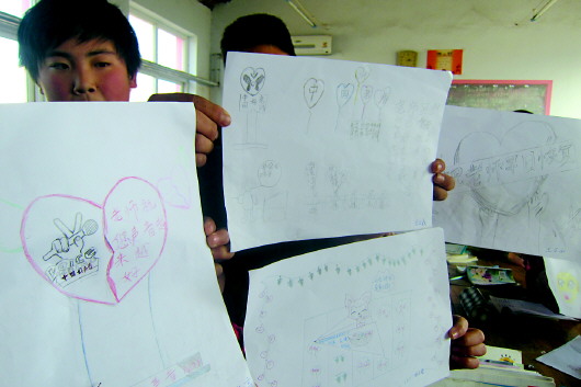 ◥平度兰河中学的学生希望有专业老师教他们美术,图为学生展示自己的作品。