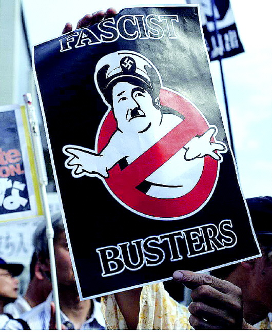 安倍召开新闻发布会宣布解禁集体自卫权的同时,数千名民众聚集首相官邸前抗议。抗议者中有退休人士和家庭主妇,也有在结束工作后赶来的上班族。许多人举着标语,高呼口号,“不要毁掉(日本宪法)第九条!”“我们反对战争!”“不要安倍!”