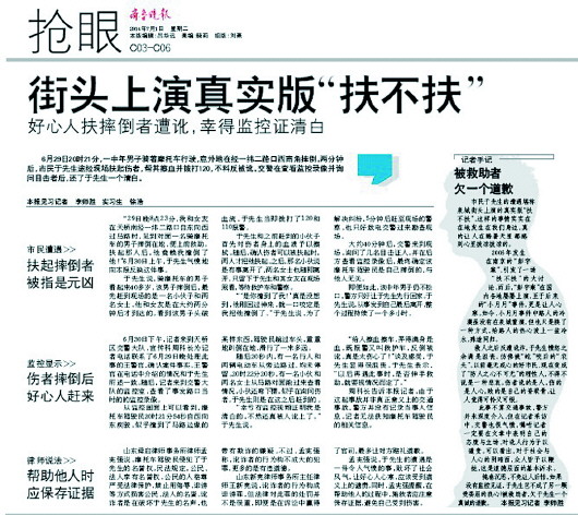 山师附小的刘庭芳老师在日常与学生们的交流中也探讨过“扶不扶”的问题。她说,她本人经历过两次类似的事情。有一次在经过千佛山脚下时,她与丈夫共同扶起过一个跌倒的老人。令刘庭芳印象深刻的是,老人在被扶起后主动对路旁围观的行人说是自己跌倒的,完全没有讹诈的意思。事后,刘庭芳将这件事写成了日记与学生们分享。