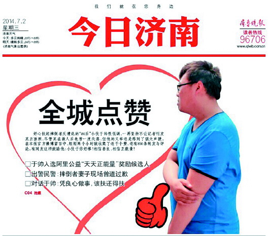 “市民于帅的行为为泉城人民传递了正能量,为小学生们树立了积极正面的榜样形象。”济南市十亩园小学的李一鸣老师说,学校一直很重视学生们的思想道德教育,无论是当年的“彭宇案”,还是去年的“三个小学生扶起老太被讹”事件,学校都组织了相应的主题班会。他个人也为于帅的行为点赞。