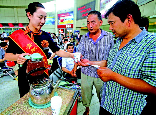 ▲总站工作人员在候车厅为旅客提供爱心绿豆汤,伴旅客清凉旅途。