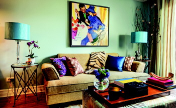 如果客厅没有挑高,但面积足够大,也可以将其中一面墙变成一整幅油画,但色彩不要过于浓烈,可以根据主人的喜好挑选合适的风格。当清晨的阳光照射在整墙的油画上,反光使色彩更加变幻,而落霞又会让色彩更加丰富,客厅在一天不同时间都会有不同的别样情调。如果客厅不大,则可选择一幅面积适中、但色彩较为浓烈的长静物油画横挂于沙发之上。
