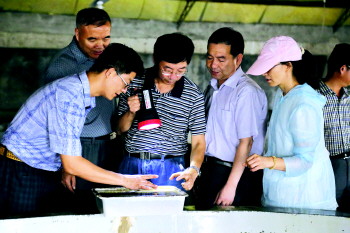 2日下午,验收组专家在试验基地内抽样,对海肠苗各项数据进行测量。 本报记者 韩逸 摄