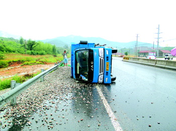 下坡拐弯时货车侧翻,车上的石子散落一地。 受访者供图