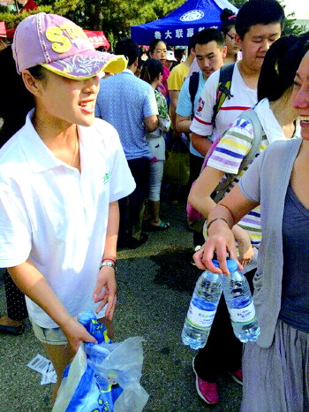 我们已经替这位同学找到了烟台十三中考点参加爱心送水的同事,我们的同事想通过媒体传递小妹妹的正能量,向全体考生和家长送祝福。祝孩子们前程似锦,即便暂时没有考出理想成绩的孩子也不要气馁,世界上就怕认真二字,只要认真付出总有收获。祝家长们工作顺利,万事如意!你们是最可爱的人,你们辛苦了!
