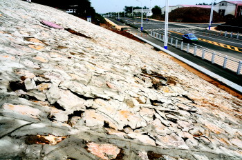 7月2日,在新修的岔河滨河东路,一场雨过后,三八路附近的一段护坡开始出现多处脱落,让人看了颇有几分担忧。 本报记者 马志勇 摄