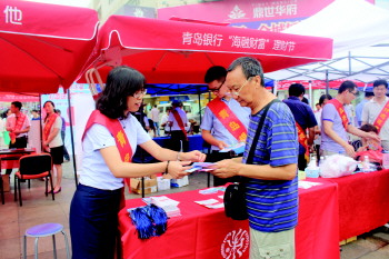 青岛银行的工作人员向市民介绍电信诈骗的手法。