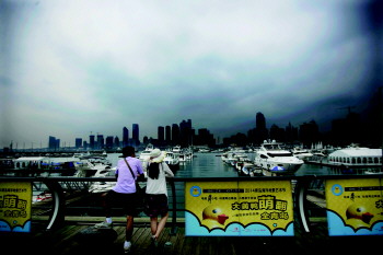 2日下午,在奥帆中心,两位市民在阴云密布的海边看风景。当日中午,岛城天空乌云密布,似乎预示着一场大雨即将到来,但令人意外的是,天空只是短暂降下一点小雨。
