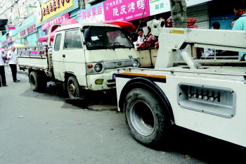 民警安排拖车将该辆僵尸车清障。 周衍鹏 摄
