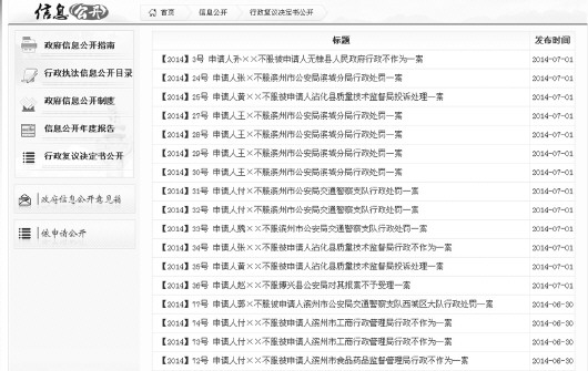 记者从滨州市政府法制网看到,网站最早公开了一件孙某不服无棣县人民政府不作为的行政复议案件,最终因申请人所述与事实不符被驳回。6月30日,“中国·滨州”政府门户网站公开了9件行政复议案件。7月1日,22件行政复议案件均在两网站公开。