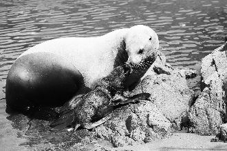 两只小海狮的妈妈们可是尽心尽力照顾它们。因为刚出生的小海狮不能下水,两位妈妈就待在岸边礁石上陪宝宝们晒太阳。妈妈们总是将小海狮放在身边看着,如果海水涨潮,就会用嘴把宝宝们叼到更高一点的礁石上。约一周后,妈妈们才会让海狮宝宝们下水并练习游泳。