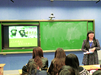 ▲青年教师微型文化讲坛——史新艳老师讲解《士兵突击中的文化事》。