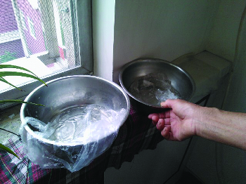 高女士家卧室窗台上的盆里接到的雨水 本报记者 张童摄