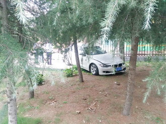 撞人车辆撞进了绿化带。 本报记者 韩微 摄
