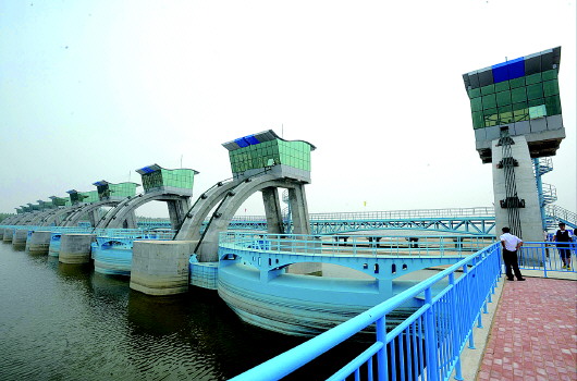 大沽河移风镇水坝是亚洲最大的护镜式水闸,每道水闸宽25米。 本报记者 张晓鹏 摄