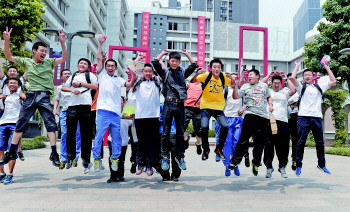中考结束后,考生跳跃欢笑,升入高中将是他们的一个新起点。(资料片)。 本报记者 周青先 摄