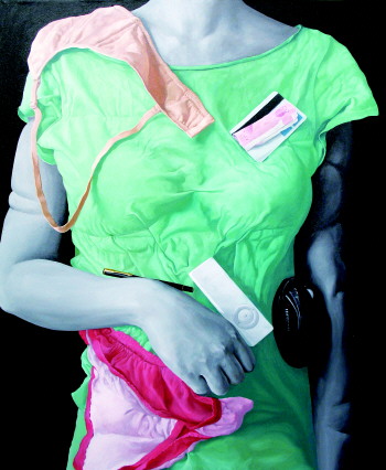 焦:在《无形的束缚》中,我最想表现的是一种对欲望、对现实的思考。我把人的躯体处理成黑白灰色调,而身上摆满的那些充满欲望的物件却是色彩鲜明的,一只无力的手下垂,勉强托衬着代表求知欲望的钢笔。这表明,我们过分沉溺于外界诱惑之中无法自拔,是一种束缚。