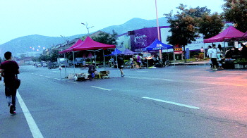 7月4日下午6:30,在章丘市双山街道的文化路上,有一个商贩在文化路路中央设摊卖水果,有不少行人躲避着来往的车辆走过去买水果,十分不安全。 见习记者 石剑芳 摄