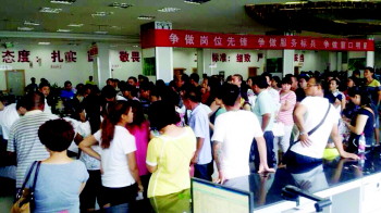7日,是小学报名的最后一天,德州市房管中心迎来“开证高峰”,现场人员爆棚,工作人员为维持秩序用上了扩音喇叭。 本报记者 贺莹莹 王小会 摄影报道