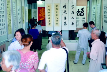 近日,乐陵市“衡水老白干杯”第一届书法展成功举办,来自社会各界的120余幅作品参展。图为展出期间书法爱好者在欣赏书法作品。 王涛 摄