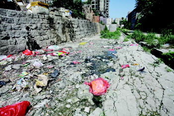 水清沟河道里遍布垃圾。 本报记者 杨广帅 摄