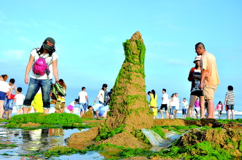 图为7日中午,游客用浒苔装饰后的沙雕作品“巴黎沙塔”。