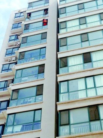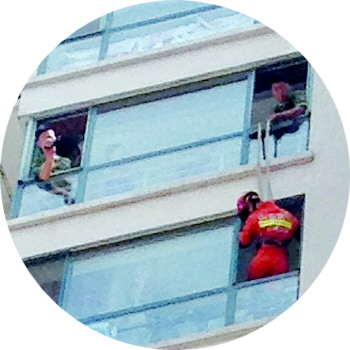 图为消防员从十一楼“空降”到十楼。