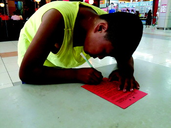 本报泰安7月7日讯(见习记者 杨思华) 7日中午,在本报报童营销秀大润发报名点,12岁的赵锐在妈妈陪同下报名营销秀,想借此机会好好锻炼自己。