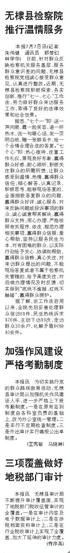 本报7月7日讯(记者 朱伟健 通讯员 郑梦幻 林学华) 日前,针对群众反映检察机关服务基层、服务群众意识差的问题,无棣县检察院党组诚心接受群众意见,认真进行整改。近期,无棣县检察院积极探索,务实创新,推行“七一、七心”工作法,努力做好群众来访服务工作,取得了良好的法律效果和社会效果。