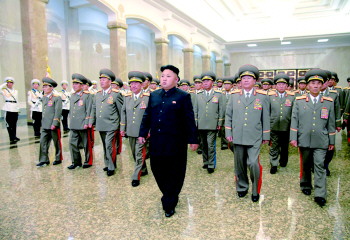 金正恩(中)8日零点参谒平壤锦绣山太阳宫,纪念朝鲜前最高领导人金日成去世20周年。