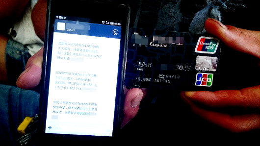 窦先生展示他的信用卡以及银行发送的他的信用卡在海外消费的短信。 本报记者 任磊磊 摄