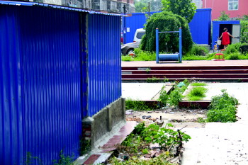 8日,记者在南小市附近的铁路宿舍南区内看到,违章建筑已占满公共领域,居民屡次举报都得不到改善,希望有关部门能好好管管。           本报记者 王小会 摄