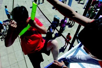 本报7月8日讯(记者 周衍鹏) 8日,市南区政府会同青岛市各区市消防大队在五四广场举办市民逃生自救体验活动,市民在现场学习密室逃生、高空逃生、扎绳索安全结等自救常识。现场一名60多岁的老人,还自行爬上高塔体验缓降,学习高空逃生。
