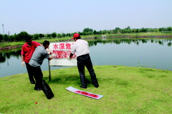 胶州市莱州路小学在水库等地方设立安全提示牌。