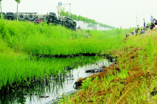 8日凌晨,城区北外环与东外环路口向北2公里处,一辆由北向南行驶的油罐车发生侧翻,泄漏的30吨原油流进了附近河流,一度遭附近村民哄抢,民警赶赴现场维护秩序。车上的司机和押车员均未受伤,事故具体原因尚不明确。 本报记者 谭正正 摄