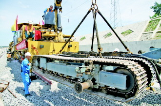 8日下午2点多,铺轨现场所有工作人员都在烈日下忙碌。记者到现场时,铺轨机刚好挪步到下一段。现场控制人员将铺轨机上的履带降落至道碴上,由履带牵引铺轨机在无轨的道碴上挪动。经过精细调试后,龙门吊将枕木吊到传送带上,依次经四个传送带运输,最后经布枕架将枕木铺到道碴上。枕木铺设完成后,工作人员用轨距挡块、螺纹道钉、弹条、平垫圈等钢轨连接件,连接钢轨与枕木。